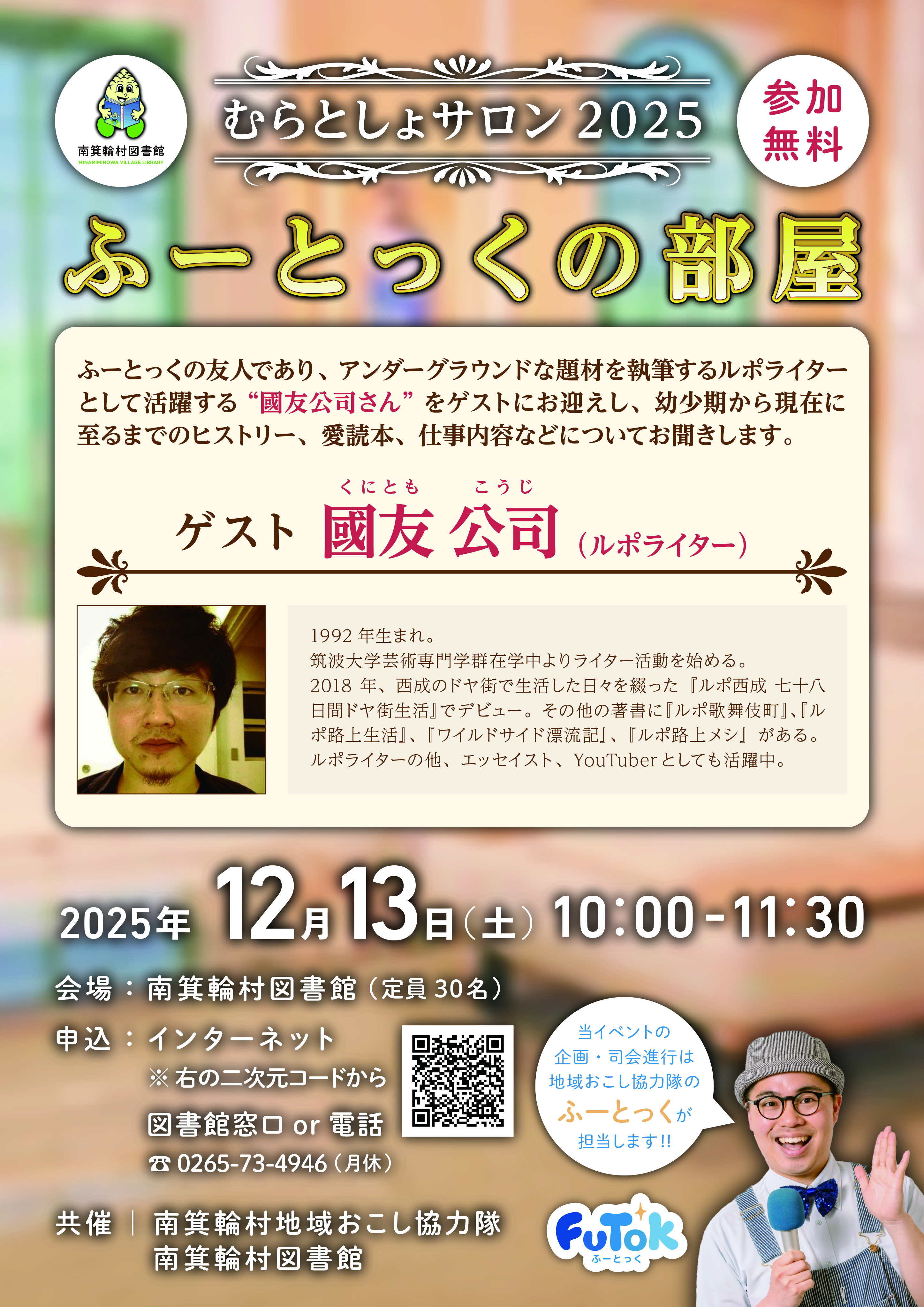 地域おこし協力隊”ふーとっくさん”の友人で、アンダーグラウンドな題材を執筆するルポライターとして活躍中の”國友公司さん”をゲストにお迎えし、幼少期から現在に至るまでのヒストリー、愛読本、仕事内容などについてお聞きします。
